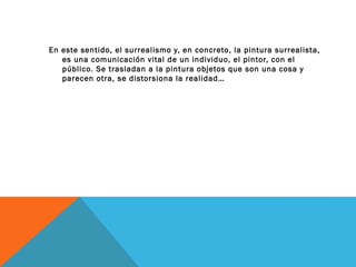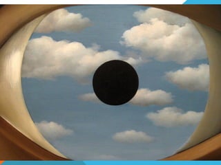 Este documento presenta resúmenes breves de varias obras pictóricas del artista surrealista René Magritte. Describe cuadros como El hijo del hombre, El modelo rojo, Golconde, La leyenda dorada, El maestro de escuela, El vestido de la noche, Los amantes, El ramillete perfecto, El falso espejo y Ceci nest pas une pipe, resumiendo sus características visuales clave y los temas recurrentes en la obra de Magritte como figuras de espaldas, medias lunas y juegos con