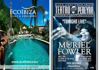 Este documento contiene información sobre música, moda y eventos en Ibiza. Incluye una lista de los 10 mejores temas musicales del mes, perfiles de DJs y productores, una reseña de la fiesta "Paradise" en DC10, detalles sobre alquiler de autos de lujo, y artículos sobre oído absoluto y lenguaje musical. El documento también proporciona números de contacto y enlaces web para varios restaurantes, clubes y servicios en la isla.