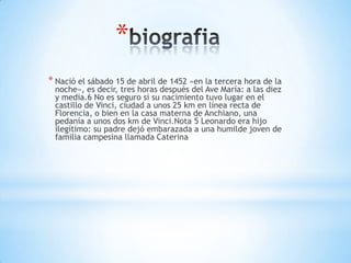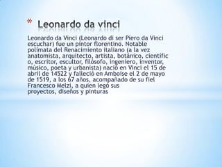 Leonardo da Vinci fue un renombrado polimata del Renacimiento italiano nacido en Vinci, Italia en 1452. Fue pintor, anatomista, arquitecto, artista, botánico, científico, escritor, escultor, filósofo, ingeniero, inventor, músico, poeta y urbanista. Murió en Francia en 1519 a los 67 años, dejando sus proyectos y pinturas a su alumno Francesco Melzi.
