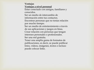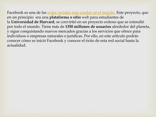 Este documento resume el origen y éxito de Facebook. Comenzó como una red social para estudiantes de la Universidad de Harvard y ahora tiene más de 1350 millones de usuarios en todo el mundo. Explica cómo Facebook se ha convertido en una plataforma exitosa gracias a los servicios que ofrece a individuos y empresas.