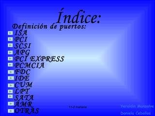 Este documento proporciona definiciones y descripciones breves de varios tipos de puertos y buses de expansión comúnmente utilizados en las placas base de las computadoras personales, incluyendo ISA, PCI, SCSI, AGP, PCI Express, PCMCIA, FDC, IDE, CUM, LPT, SATA, AMR y otros. Explica sus características, propósitos y diferencias.