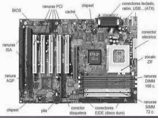 La tarjeta madre es la pieza central de una computadora y conecta los diferentes componentes. Incluye el procesador, memoria cache y ranuras de expansión para conectar otros componentes. El procesador y la memoria cache afectan el rendimiento, mientras que la tarjeta madre incluye los enchufes correctos para conectar diferentes tipos de procesadores.
