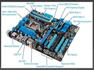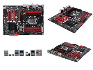 Este documento presenta una variedad de tarjetas madre y procesadores de Intel y AMD. Brevemente describe las características clave de placas madre como la ECS Black Extreme P67H2-A, CROSSHAIR V FORMULA-Z, SABERTOOTH Z77 y M5A88-V EVO. También resume procesadores como los Intel Core i7, i5 e i3 de tercera generación, así como los AMD FX, A-Series y Phenom II.