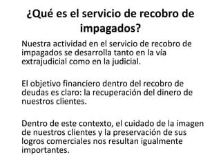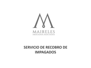 Este documento describe los servicios de recobro de impagados de la firma Maireles & Asociados. Ofrecen servicios de recobro de deudas tanto de forma amistosa como judicial. Su objetivo es la recuperación del dinero adeudado a sus clientes de forma rápida y cuidando la imagen de estos. Para ello estudian cada caso y determinan la mejor estrategia, ya sea intentando primero un acuerdo amistoso o iniciando directamente acciones legales con sus abogados especializados. No cobran honorarios a menos que se recupere el dinero ade