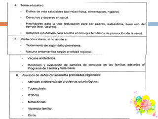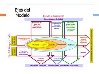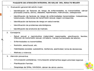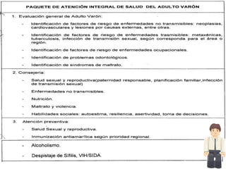Este documento presenta un modelo de atención integral para adultos entre 20-59 años en una comunidad de aproximadamente 7800 habitantes. El modelo se centra en satisfacer las necesidades de salud de los adultos a través de cuidados esenciales, promoción, prevención, recuperación y rehabilitación. El objetivo es atender integralmente la salud de los adultos, prevenir enfermedades comunes, fomentar el autocuidado y detectar factores de riesgo para mejorar la cobertura y reducir los costos de atención.