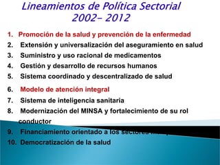 Este documento presenta 10 lineamientos de política sectorial para el periodo 2002-2012 en el Perú. Los lineamientos incluyen: 1) la promoción de la salud y prevención de enfermedades, 2) la extensión del aseguramiento en salud, 3) el suministro y uso racional de medicamentos, 4) la gestión y desarrollo de recursos humanos, 5) un sistema coordinado y descentralizado de salud, 6) un modelo de atención integral, 7) un sistema de inteligencia sanitaria, 8) la modernización del MINSA