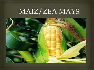 Este documento describe el maíz. Explica que es una monocotiledónea anual de la familia de las poáceas originaria de México. Actualmente es el cereal más producido en el mundo. Proporciona valor nutricional y enumera beneficios como antioxidantes, saciedad y apoyo cardiovascular. Finalmente, incluye dos recetas sencillas de mazorcas de maíz gratinadas con queso y con mayonesa y perejil.