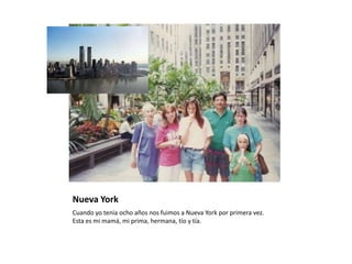 Este documento contiene resúmenes breves de varios eventos en la vida de la persona. Incluye recuerdos de ir de vacaciones a una casa en las montañas cuando era niña, un viaje a Nueva York a los 8 años, un viaje solo a Montenegro a los 15 años, asistir a una boda cuando tenía 19 años, y un viaje a Grecia y Estados Unidos para eventos deportivos. En cada sección, la persona comparte recuerdos breves sobre la experiencia y algunas fotos de familiares y amigos.