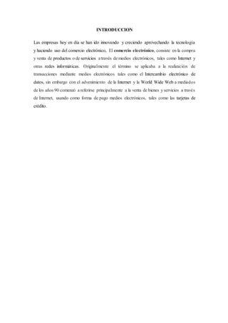 Este documento describe la empresa en línea "Majito Dulce Expresión" en Ecuador. Fue creada por María José Espejo en 2015 en Santo Domingo para vender dulces a través de Facebook e WhatsApp. Antes de abrir su tienda física, María José publicó fotos y videos de sus productos en Facebook para generar interés. Esto resultó en pedidos antes de que comenzara las operaciones. El documento concluye que las empresas deben innovar y actualizarse como la tecnología, por lo que la estrategia digital de Majito Dulce