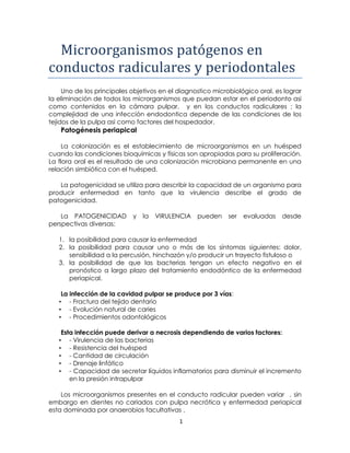 Este documento describe los principales microorganismos patógenos encontrados en conductos radiculares y el periodonto, incluyendo Enterococcus faecalis, Fusobacterium nucleatum y Eikenella corrodens. Explica los métodos para la obtención de muestras, el transporte, cultivo e identificación de estos microorganismos, así como las características clave de cada uno. El objetivo es lograr el diagnóstico microbiológico oral a través de la eliminación completa de todos los microorganismos dañinos en la cavidad pulpar