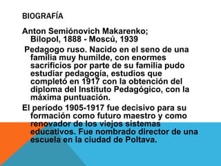 Anton Makarenko fue un pedagogo ruso que desarrolló sus ideas educativas en dos etapas. Primero dirigió comunas para niños y jóvenes delincuentes, enfatizando la creación de conciencia de grupo y el trabajo productivo. Luego criticó la educación familiar y escolar rusa, argumentando que la educación debe enfocarse en formar al hombre para el bien común desde una perspectiva comunista. Makarenko creía que la escuela debe ser una colectividad con metas comunes y que la individualidad del niño debe absorberse en