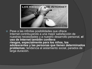 Las redes sociales pueden conllevar riesgos, especialmente para los niños y adolescentes. Aunque las redes sociales no son inherentemente malas, algunas personas las usan con fines maléficos como engañar a jóvenes para citas. El documento recomienda mantener un perfil privado en las redes sociales, evitar añadir desconocidos y no publicar información personal para proteger la privacidad e intimidad.