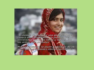 Malala Yousafzai nació en Swat, Pakistán y a los 14 años fue víctima de un atentado por parte de los talibanes por promover la educación de las niñas. A pesar de recibir un disparo en la cabeza, sobrevivió y continúa luchando por el derecho a la educación de todas las niñas.