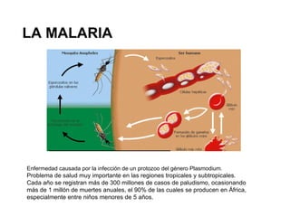 La malaria es una enfermedad causada por un protozoo que infecta a cientos de millones de personas anualmente, causando más de un millón de muertes. Los tratamientos para la malaria han evolucionado a lo largo de los años, comenzando con la quinina en 1638, luego el atabrine y la cloroquina. Actualmente, el tratamiento más efectivo es la artemisinina, un derivado de la planta Artemisia annua que actúa rápidamente y puede combinarse con otros medicamentos para formar terapias efectivas que protegen contra la resistencia a