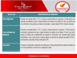 La malaria es una enfermedad infecciosa febril aguda causada por parásitos del género Plasmodium que son transmitidos por la picadura de mosquitos hembras Anopheles. Los síntomas van desde procesos asintomáticos hasta cuadros severos que pueden llevar a la muerte. El diagnóstico se realiza mediante un examen microscópico de gota gruesa de sangre y el tratamiento depende del parásito, la gravedad de los síntomas y factores como el embarazo.