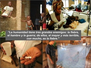 La malaria es una enfermedad parasitaria transmitida por la picadura de mosquitos infectados del género Anopheles. Es causada por parásitos del género Plasmodium, siendo las especies más comunes P. falciparum, P. vivax, P. ovale y P. malariae. Afecta principalmente a regiones tropicales y subtropicales. Su diagnóstico se realiza mediante el examen microscópico de frotis sanguíneos para detectar las formas parasitarias, y su tratamiento depende de la especie de