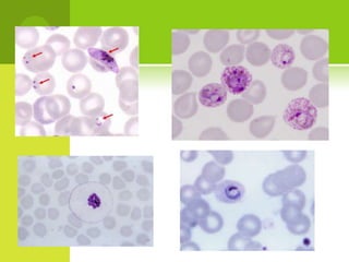 Este documento resume la etiología, epidemiología, manifestaciones clínicas, diagnóstico y tratamiento de la malaria en Colombia. Detalla que las especies de Plasmodium que causan la malaria son P. falciparum, P. vivax, P. malariae y P. ovale, y que es transmitida por la hembra del mosquito Anopheles. Entre 2000-2005 hubo 701,182 casos reportados de malaria en Colombia, siendo la mayoría casos de P. vivax y P. falciparum. La malaria grave requiere hospitalización y tratamiento intravenoso con qu