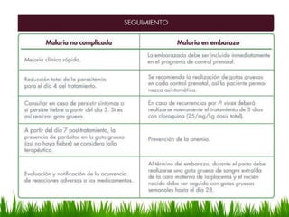 Malaria es una enfermedad causada por parásitos del género Plasmodium y transmitida por la picadura de mosquitos Anopheles. Se presenta más en zonas tropicales debajo de los 1,500 msnm. Causa síntomas como fiebre, escalofríos y malestar general. El diagnóstico se realiza mediante examen microscópico de sangre o pruebas rápidas. Su tratamiento depende de la gravedad de los casos y la especie de Plasmodium involucrada.