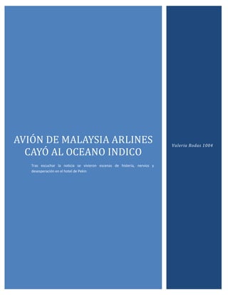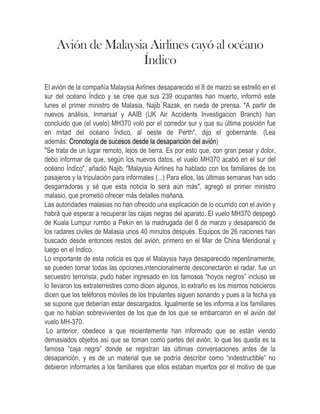 El primer ministro de Malasia anunció que el avión de Malaysia Airlines que desapareció el 8 de marzo se estrelló en el sur del océano Índico y que los 239 pasajeros a bordo probablemente murieron. Las autoridades determinaron la ubicación final del avión basándose en un análisis de Inmarsat y la AAIB del Reino Unido. Aunque se han encontrado varios objetos en el océano, aún no se han recuperado las cajas negras ni los cuerpos, por lo que no está del todo claro qué causó el accidente.