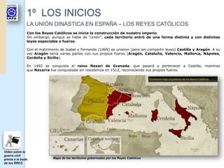 Los Reyes Católicos iniciaron la construcción del imperio español en el siglo XVI a través de la unión dinástica de Castilla y Aragón, aunque cada territorio mantuvo sus propias leyes. Lograron la unidad religiosa mediante la Inquisición y fortalecieron la monarquía. Carlos I y Felipe II ampliaron los territorios conquistando nuevas zonas y enfrentando conflictos externos como la rivalidad con Francia y la expansión del Imperio Otomano, aunque el imperio español entró en declive