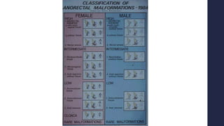 Las malformaciones ano-rectales son defectos congénitos raros con una incidencia de 1 en 5000 nacimientos. Se clasifican según su gravedad y la presencia de fístulas. El diagnóstico se realiza con radiografías e imágenes como TAC o RMN. El tratamiento depende del tipo de malformación y puede incluir colostomía protectora y posterior reparación quirúrgica. Requieren seguimiento a largo plazo debido a posibles complicaciones como incontinencia o problemas funcionales.