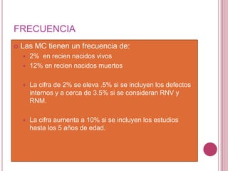 Este documento resume la prevalencia de malformaciones congénitas (MC) en diferentes poblaciones. Reporta que la prevalencia de MC es de aproximadamente 2% en recién nacidos vivos y 12% en recién nacidos muertos. La prevalencia es similar entre estudios y poblaciones pero varía entre grupos étnicos. También discute que la prevalencia ha disminuido en países desarrollados pero se ha mantenido estable en países en desarrollo, donde las MC son una de las principales causas de mortalidad infantil. Finalmente, identifica algun
