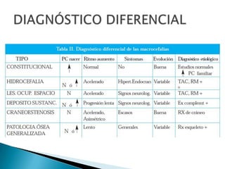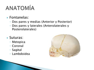 El documento describe las características anatómicas del cráneo al nacer, incluyendo fontanelas y suturas. Explica que la craneosinostosis es la fusión prematura de una o más suturas, pudiendo ser primaria o secundaria a otras condiciones. Detalla los tipos de craneosinostosis, síntomas, exámenes de diagnóstico y tratamiento quirúrgico temprano para evitar complicaciones. También aborda las causas y manifestaciones de macrocefalia y microcefalia, así como los exámen