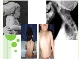 Este documento resume diferentes tipos de malformaciones óseas, incluyendo anomalías óseas generalizadas como el gigantismo, osteopetrosis y osteogénesis imperfecta; malformaciones craneanales como la craneosinostosis, microcefalia y síndrome de Crouzon; malformaciones de la columna vertebral como la espina bífida y la espondilolistesis; y malformaciones del tórax como el tórax excavado y en quilla. El documento describe las características clínicas de cada condición.