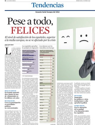 El documento resume los resultados de la Encuesta Social Europea de 2012 sobre el nivel de felicidad y satisfacción de vida de los ciudadanos europeos. A pesar de la profunda crisis económica en España, los españoles reportan un alto nivel de felicidad personal superior al promedio europeo. Sin embargo, la confianza en los políticos y las instituciones en España ha disminuido. Además, los españoles están más involucrados en actividades políticas no convencionales como manifestaciones y recogidas de firmas que el promedio europeo, lo que sugiere
