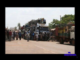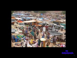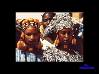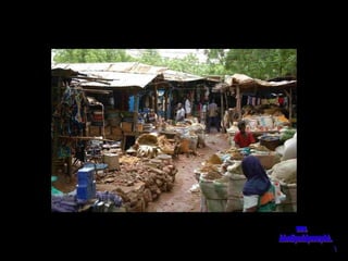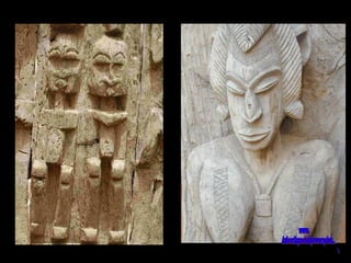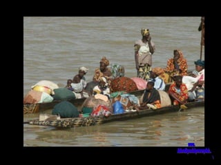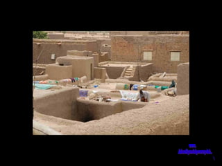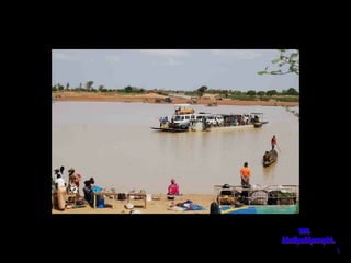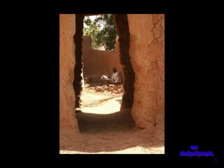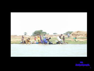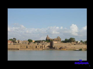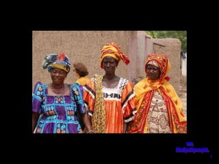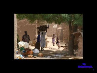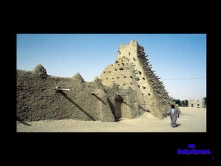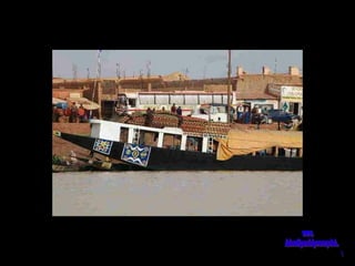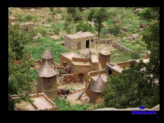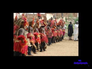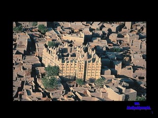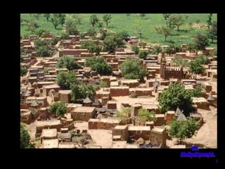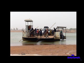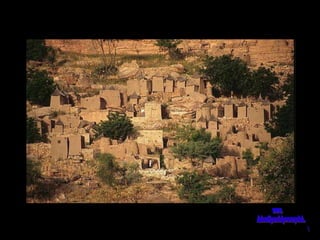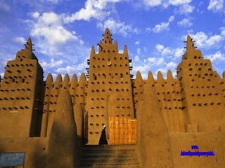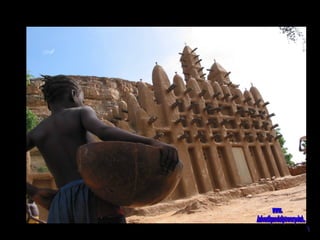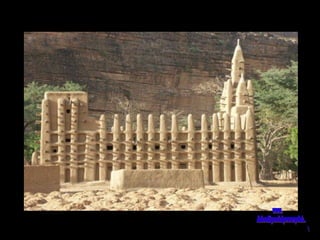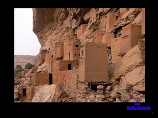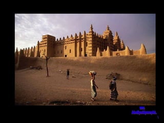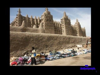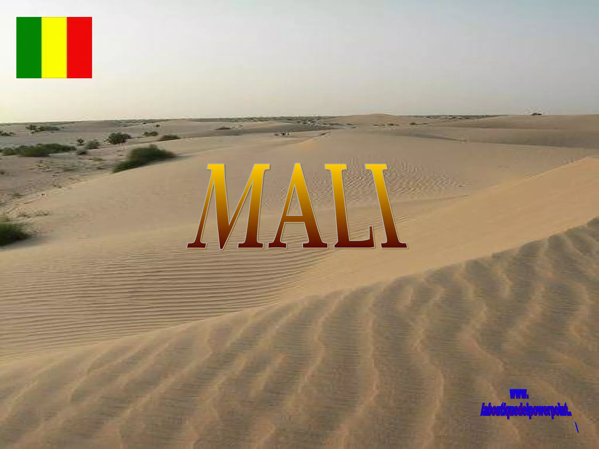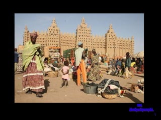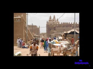 Mali se encuentra en el África occidental, al sur del desierto del Sahara. Limita con varios países y su capital es Bamako. El documento describe varias ciudades y lugares notables de Mali, incluyendo Tombuctú, Mopti, Djenné, la Falla de Bandiagara, las Cuevas de Songo y el Delta interior del Níger. Estos lugares ofrecen oportunidades para explorar la cultura, la historia y el paisaje de Mali.