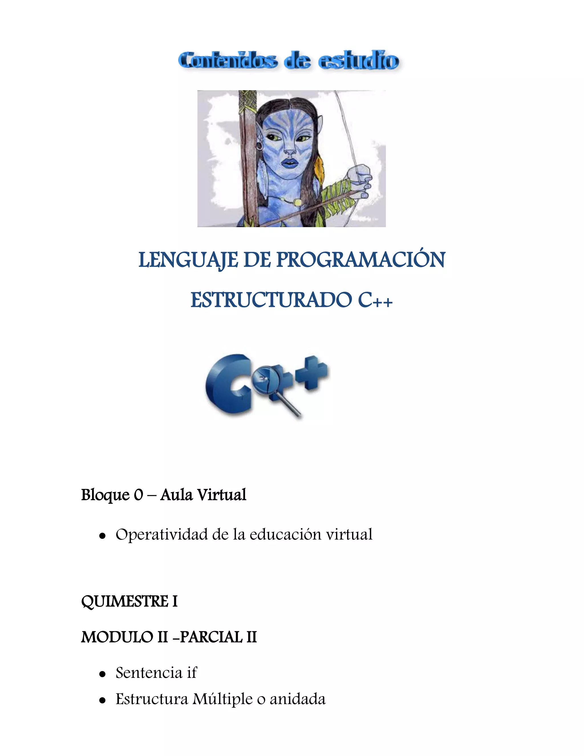 El documento presenta el plan de estudios de un curso de programación estructurada en C++, dividiéndolo en dos cuatrimestres. Cada cuatrimestre contiene varios módulos con temas como sentencias condicionales, ciclos repetitivos, y arreglos, así como diagramas de flujo y ejercicios de aplicación para cada tema.