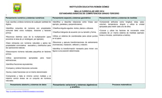 Este documento presenta la malla curricular de matemáticas para tercer grado de una institución educativa. Describe los estándares básicos de competencia en pensamiento numérico, geométrico, métrico, aleatorio, variacional y procesos matemáticos. Incluye contenidos, estrategias de nivelación y recursos didácticos para cada unidad temática del año.