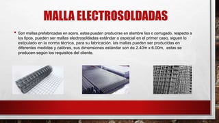 El documento describe diferentes tipos de mallas electrosoldadas, incluyendo sus usos, beneficios y empresas productoras. Las mallas electrosoldadas son mallas prefabricadas de acero utilizadas para reforzar elementos de hormigón como losas, muros y piezas prefabricadas. Son sencillas de instalar y vienen en diferentes medidas y calibres. Algunos tipos comunes son las mallas galvanizadas, de acero y de refuerzo.
