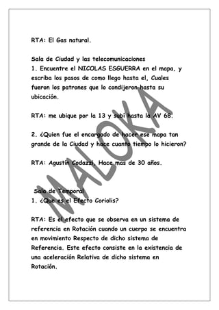 Este documento resume las respuestas a preguntas sobre varias salas interactivas en Maloka, un museo de ciencia en Bogotá, Colombia. Las salas incluyen la casa inclinada, el petróleo y el gas natural, mapas de la ciudad, efectos meteorológicos, comunicaciones vía satélite, el sistema solar, sismos, el origen de la vida, y una comparación del cine domo con películas 3D.