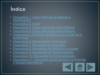 Este documento presenta un resumen de una presentación sobre la pirámide de necesidades de Maslow. La presentación incluye 11 diapositivas que describen la teoría de Maslow, la estructura piramidal de necesidades desde las fisiológicas hasta la autorrealización, y una conclusión sobre cómo la pirámide puede ayudar a satisfacer las necesidades de las personas y empleados.