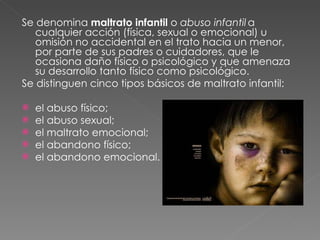 El maltrato infantil abarca acciones u omisiones que causan daño físico o psicológico a menores, incluyendo abuso físico, sexual, emocional y negligencia. Su definición es compleja y varía según la edad del niño y la percepción social, y puede tener consecuencias a largo plazo en su desarrollo. Además, el maltrato es un problema social que puede contribuir al aumento de la criminalidad juvenil y afecta la relación familiar al destruir la confianza y el amor.