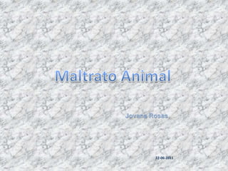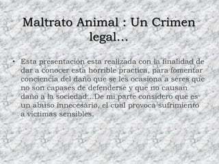 Este documento trata sobre el maltrato animal, definido como cualquier causa de daño, sufrimiento o estrés innecesario hacia un animal. Señala que el maltrato puede ocurrir por negligencia o intencionalmente y da ejemplos como no alimentar adecuadamente a una mascota o golpear a un animal. También critica tradiciones como los toros de lidia y los circos que lucran con el sufrimiento animal. El documento pide apoyar la lucha contra el maltrato animal y cuidar a los animales que dependen de nosot