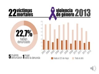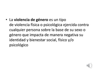 El documento trata sobre la violencia de género y las formas de abordarla. Explica que la violencia de género es un tipo de violencia física o psicológica contra personas sobre la base de su sexo o género. Además, señala que las personas cercanas a la víctima deben ayudarla llamando a la policía o apoyándola como testigos. Por último, resalta la importancia de la prevención mediante la educación para valorar los sentimientos de los demás y expresarlos de forma justa.