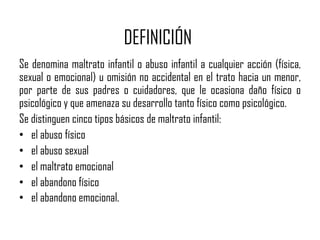 Este documento define el maltrato infantil como cualquier acción u omisión no accidental por parte de los padres o cuidadores que cause daño físico o psicológico a un menor o amenace su desarrollo. Se distinguen cinco tipos básicos de maltrato: abuso físico, abuso sexual, maltrato emocional, abandono físico y abandono emocional. El documento luego describe los indicadores del abuso físico y explica que la negligencia se identifica por la falta de proveer las necesidades básicas de un niño. Finalmente,
