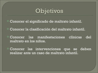 El documento habla sobre el maltrato infantil, definiéndolo y clasificándolo. Explica que puede incluir maltrato físico, emocional, abandono y abuso sexual. También describe algunos indicadores de maltrato en niños y factores de riesgo en los padres. Finalmente, explica las consecuencias que puede tener el maltrato en el desarrollo psicosocial de los menores.