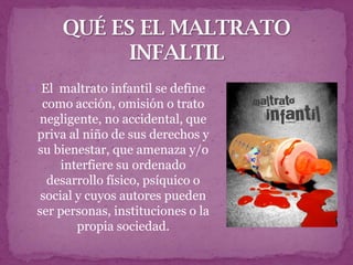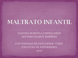Este documento presenta estadísticas sobre el maltrato infantil en Santander, Colombia. Reporta que en 2006 hubo 114 casos de maltrato infantil, 32 menos que en 2005, con una disminución del 21%. Además, cerca de 40 niños son víctimas de abuso sexual y 28 de maltrato físico cada año en la región. Finalmente, en 2007, 25 niños murieron en Bucaramanga por homicidios, siendo la principal causa de muerte violenta de menores.