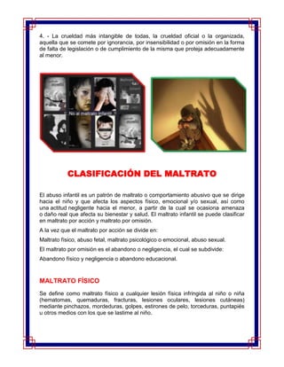 El documento describe las diferentes formas de maltrato infantil, incluyendo el maltrato físico, emocional, sexual y por negligencia. Explica que el maltrato puede ocurrir en el hogar, la escuela o la guardería, y ofrece indicadores de conducta y físicos que pueden revelar si un niño está siendo maltratado. Además, clasifica el maltrato según la edad del niño y explica cómo se manifiesta en bebés, niños que gatean y de otras edades.