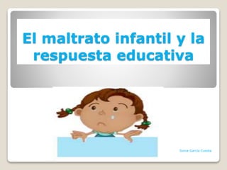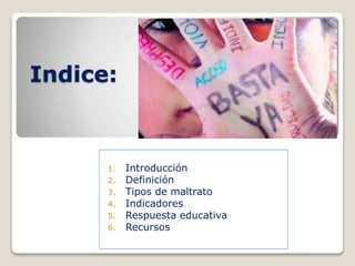 Este documento trata sobre el maltrato infantil y la respuesta educativa. Define el maltrato infantil según la OMS e identifica cinco tipos principales: abuso físico, abuso sexual, maltrato emocional, abandono físico y abandono emocional. También describe indicadores del maltrato en niños y padres. Finalmente, explica cómo los profesores y centros educativos deben responder ante la sospecha o evidencia de maltrato, notificando a servicios sociales o autoridades judiciales.