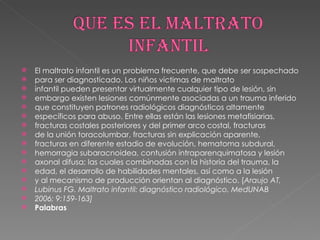 El documento habla sobre el maltrato infantil y los indicadores que pueden ayudar a diagnosticarlo. Entre los indicadores físicos se encuentran lesiones como fracturas costales posteriores, hematomas subdurales y hemorragias subaracnoideas. Los indicadores de conducta incluyen bajo rendimiento escolar, depresión, docilidad excesiva y conductas sexualizadas inadecuadas para la edad. El maltrato infantil puede ocurrir de diferentes formas, desde violación y asesinato hasta la negación de amor.
