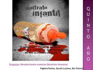 El documento define el maltrato infantil como actos o carencias que afectan gravemente el desarrollo del niño ejecutados por padres, cuidadores o adultos cercanos. Recuerda que los niños son el presente y no solo el futuro, y promueve cuidar la infancia ya que los niños son el futuro de nuestro planeta.