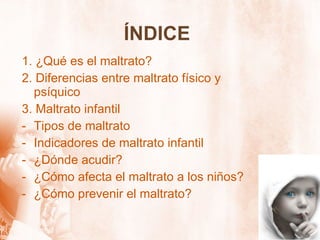 El maltrato infantil es un problema global que afecta a los niños en diversos entornos, incluidos el hogar y la escuela, y puede manifestarse en formas físicas y psicológicas. Los tipos de maltrato incluyen maltrato físico, emocional y abandono, lo que causa un impacto negativo en el desarrollo del niño. La identificación temprana de indicadores de maltrato es crucial para buscar ayuda y prevenir daños a largo plazo en la salud física y mental del menor.