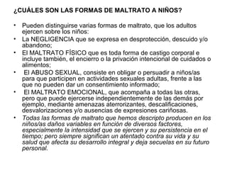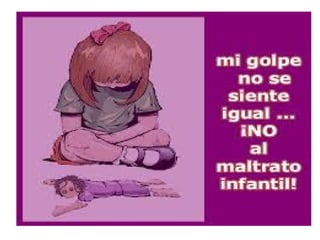 El documento describe las diferentes formas de maltrato infantil, incluyendo negligencia, maltrato físico, abuso sexual y maltrato emocional. Explica que cuando un niño informa sobre abuso o maltrato, es importante creerle, buscar asesoramiento profesional y comunicar el hecho a las autoridades pertinentes. También señala que el maltrato puede ocurrir en la escuela por parte de un docente, y que en esos casos la protección del niño debe ser la prioridad a pesar de las dificultades que esto pueda generar.