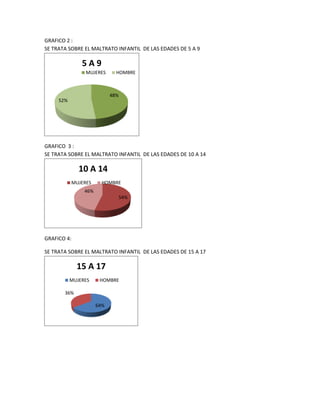 El documento presenta estadísticas sobre el maltrato infantil en Bogotá según la edad y el sexo. Muestra que entre las edades de 0 y 4 años, el 43% de los casos de maltrato corresponden a niñas y el 57% a niños. Entre 5 y 9 años, el 48% son niñas y el 52% niños. De 10 a 14 años, el 54% son niñas y el 46% niños. De 15 a 17 años, el 64% son niñas y el 36% niños. En general, el 64% de los casos de maltrato infantil en
