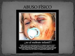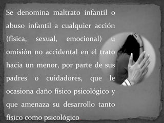 Este documento define el maltrato infantil como cualquier acción u omisión no accidental por parte de los padres o cuidadores que causa daño físico o psicológico al niño y amenaza su desarrollo. Describe los tipos de maltrato como físico, emocional, psicológico, abandono y abuso sexual. También identifica factores de riesgo como alcoholismo, violencia doméstica, drogadicción, ser padre soltero, falta de educación y pobreza. Finalmente, enfatiza la necesidad de luchar por el cambio