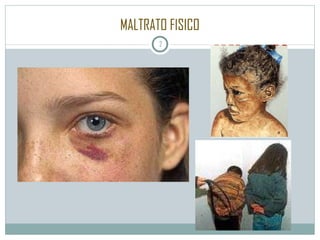 El documento describe diferentes tipos de maltrato infantil como el maltrato físico, emocional, por descuido o abandono. También describe el síndrome del bebé zarandeado, el síndrome de Munchausen por proximidad y el abuso sexual. Explica los indicadores físicos y de comportamiento de cada tipo de maltrato, así como las características familiares asociadas. Finalmente, proporciona información sobre la prevención del maltrato infantil a través de estrategias primarias, secundarias y terciarias.